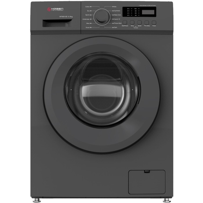 General InformationBrand Hagen Model/PN HFW610S Type Wash Construction Type Free-Standing Display Yes Machine SpecificationsLoading Type Front Washing Capacity 6 SpinSpin Class C Spin Speed 1000 Speed Adjustment Yes PerformanceWater consumption per cycle 48 Noise Level (Wash) 60 Noise Level (Spin) 74 SecurityChild Lock Yes TimerDelay Timer 3-24 Ho..